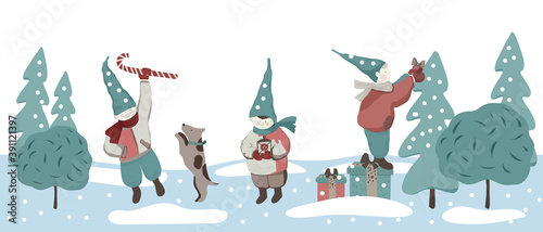 Fototapeta premium Christmas seamless pattern with the three elves in the caps. A gnome dresses up a Christmas tree, a gnome with a flashlight, a gnome with a Lollipop and a dog. Winter landscape for a banner.