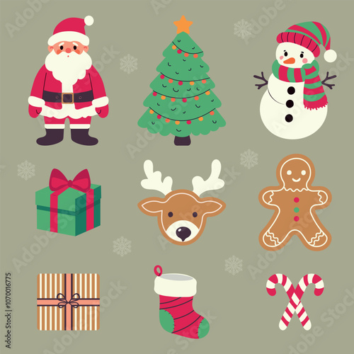Fototapeta premium Christmas set, simple flat elements, Santa Claus, Christmas tree, gifts, gingerbread, snowman, Christmas sock