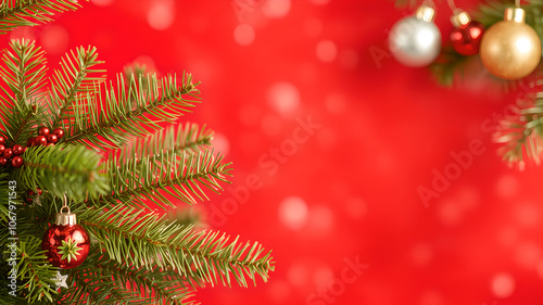 Obraz premium Christmas shiny red background with Christmas tree decorations and toys