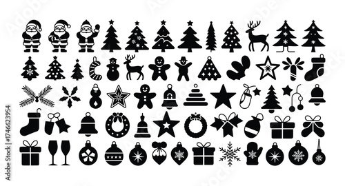 © Kavya, Fototapeta premium Christmas silhouette icon pack with Santa tree bell gift and snowflake