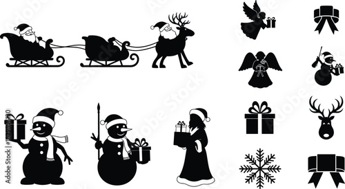 © Sabbir's World, Fototapeta premium Christmas silhouettes, Santa sleigh, reindeer, snowman, angel gift, festive icons, holiday vector, black illustration, winter design, celebration elements