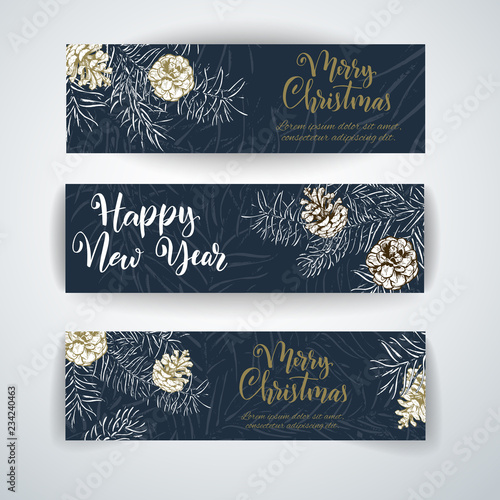 Fototapeta premium Christmas sketch hand drawn illustration with pine tree branches and cones....