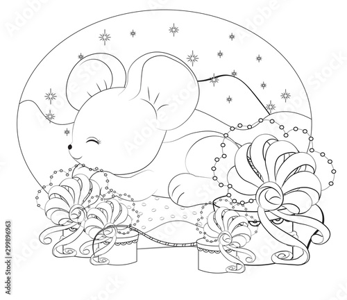 Fototapeta premium Christmas sleepping mouse in pillow Coloring book