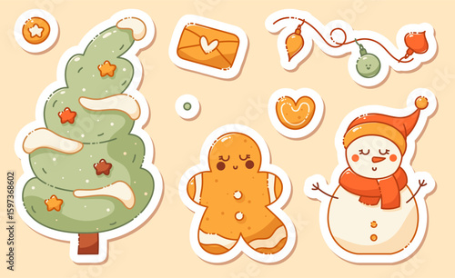Obraz premium Christmas stickers with a cute snowman, xmas tree, star, cookie, envelope...