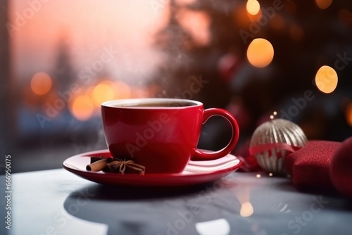 © sticker2you, Fototapeta premium Christmas still life with mug of hot coffee or cocoa. AI Generative