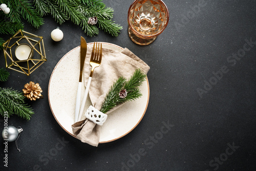 © nadianb, Obraz premium Christmas table setting. Christmas dinner - black plates with cutlery and decorations on black background.