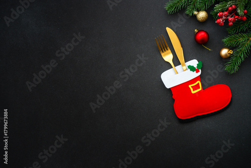 Obraz premium Christmas table setting with plate, cutlery and christmas decorations on...
