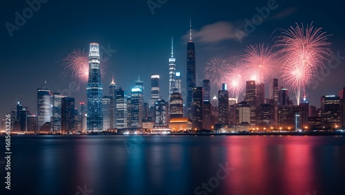 © MR HEPPY, Fototapeta premium Christmas theme, Modern city skyline decorated with Christmas lights and fireworks