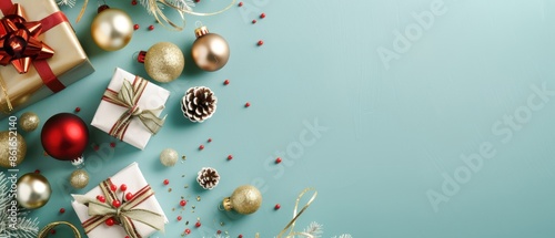 Fototapeta premium Christmas themed flat lay with ornaments and gift boxes, teal background, holiday spirit, gold and red colors