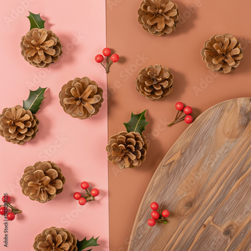 Fototapeta premium Christmas-Themed Flat Lay with Pine Cones and Red Berries
