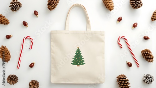 © Atallal Annas, Obraz premium Christmas tote bag with a festive tree design, surrounded by pine cones and candy canes, perfect for holiday shopping and seasonal gifting