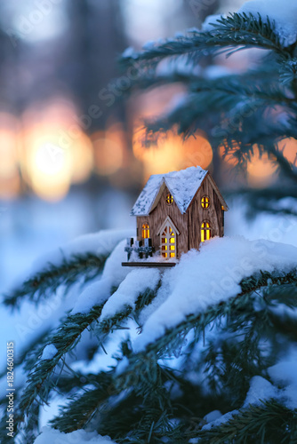 © Ju_see, Fototapeta premium Christmas toy house on snowy fir tree branch, winter nature background. Christmas, new year, Yule holidays. symbol of cozy, loving family home. fairy tale, magic atmosphere, festive winter season