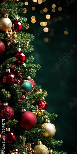 © Alex, Fototapeta premium Christmas Tree Adorned with Red and Gold Ornaments Against Dark Background in Closeup