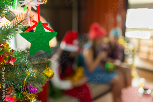 © shutterdemon, Naklejka premium Christmas tree and green star with blurred background of people in Christmas party, with copy space for text