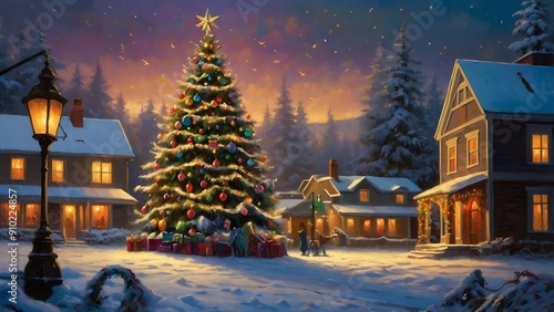 © Abdullah, Fototapeta premium Christmas tree and snow falling