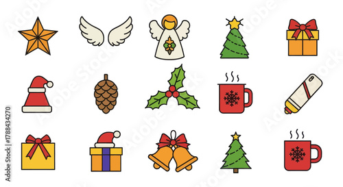 Obraz premium Christmas tree angel star gift box bell mug holly pinecone Santa hat wings