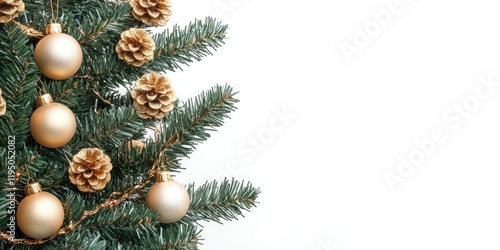 © Ahmad, Fototapeta premium Christmas tree branch with gold ornaments and pine cones on the left side against a white background featuring green needles and golden accents
