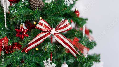 Fototapeta premium Christmas tree branches are beautifully decorated with a Xmas red and white bow.