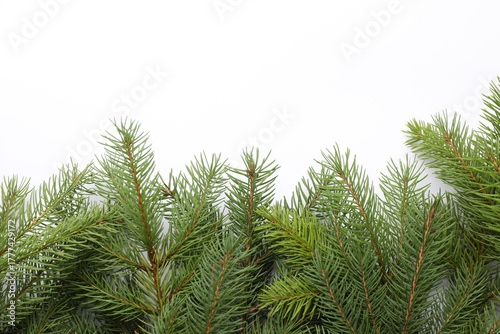 © New Africa, Naklejka premium Christmas tree branches on white background, flat lay. Space for text