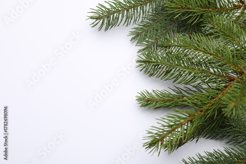© New Africa, Naklejka premium Christmas tree branches on white background, flat lay. Space for text