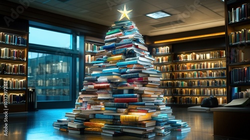 Obraz premium Christmas tree crafted from books, cozy library scene