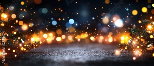 © Watcharaporn, Naklejka premium Christmas tree decorated with lights and surrounded by snow in a festive indoor setting
