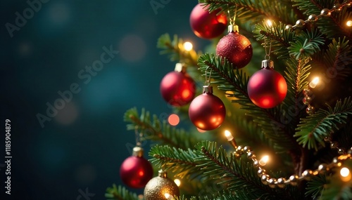 Naklejka premium Christmas tree decorated with ornaments and lights, decorations, christmas tree