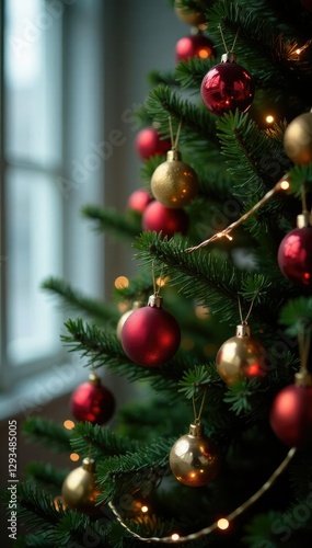 Fototapeta premium Christmas tree decorated with ornaments and lights, holiday cheer, colorful ornaments, festive lights