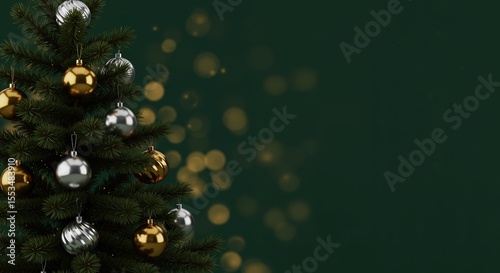Fototapeta premium Christmas tree decorated with silver and gold ornaments on green background