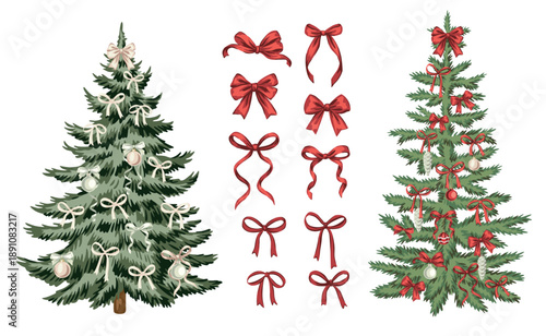 Naklejka premium Christmas tree decoration with bow and balls. Winter decor set.