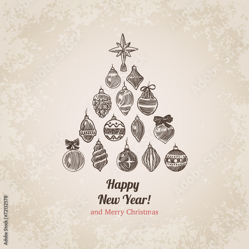 © Sentavio, Fototapeta premium Christmas tree decorations set handdrawn style postcard template