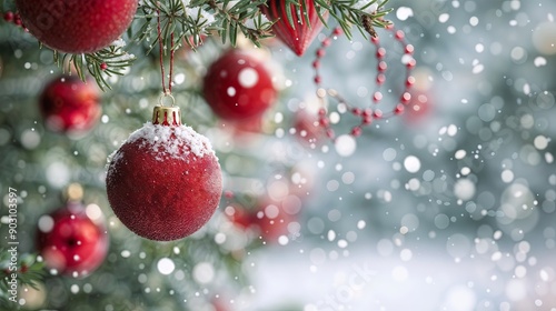 Fototapeta premium Christmas tree decorations with artificial snow and red baubles.