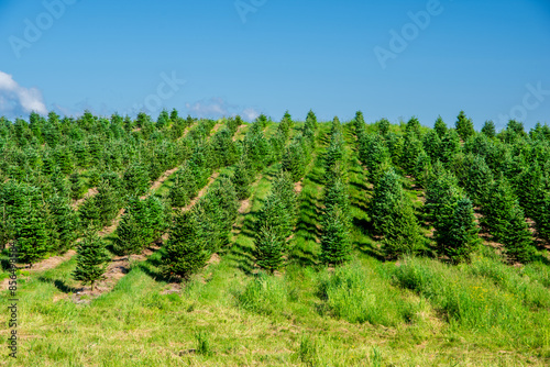 © bearle, Obraz premium Christmas tree farm in summer rows of green tress against deep blue sky