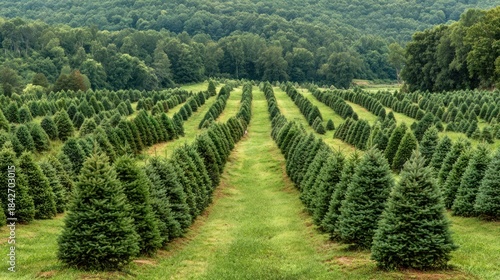 © Talha, Obraz premium Christmas tree farm with rows of pine trees