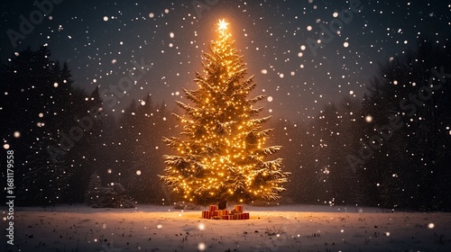 Naklejka premium Christmas tree glowing in snow at night with stars, falling snowflakes and gifts under it. Wide angle shot, perfect as high definition mobile wallpaper, winter landscape.