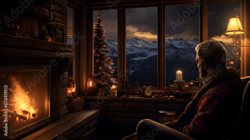 Naklejka premium Christmas tree in a wooden cabin in winter.