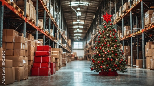 © Edi Purnomo, Fototapeta premium Christmas tree in large warehouse with stacked boxes.