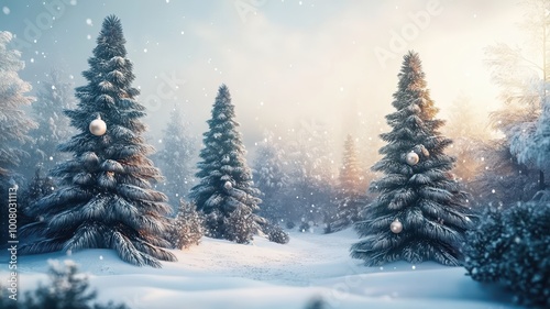 © pornsawan, Naklejka premium Christmas tree in snowdrift,winter and snow background, with Christmas ornaments glass transparent balls,banner sale product,Holiday Xmas background,vector illustration,space for text.