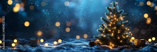 © arifat, Obraz premium Christmas tree in snowy landscape, glowing lights