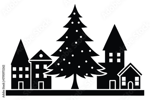© kalpona , Naklejka premium christmas tree in town square vector icon silhouet