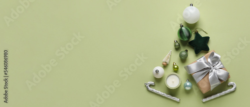 Obraz premium Christmas tree made of decorations, gift and candle on green background with space for text