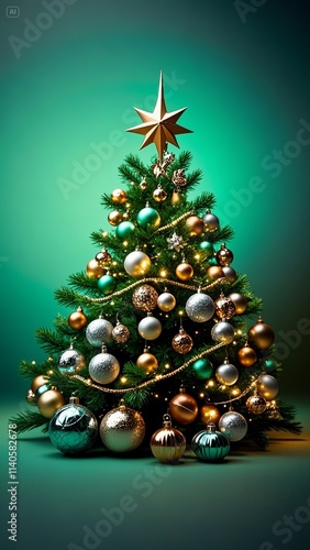 Fototapeta premium christmas tree of the lights tree stands centrally on a lush, emerald green background,