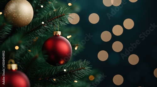 Naklejka premium Christmas tree ornaments with festive bokeh and green pine branches.