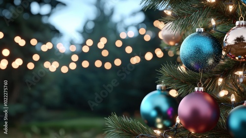 Fototapeta premium Christmas Tree Ornaments with Lights and Bokeh Background