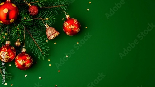 Naklejka premium 深緑の背景にクリスマスツリー、松の枝、赤とゴールドのオーナメント、冬の装飾品と贈り物Christmas Tree, Pine Branches,...