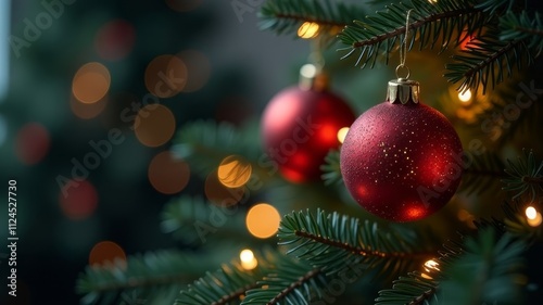Fototapeta premium Christmas Tree With Baubles And Blurred Shiny Lights
