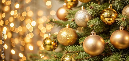 © Mamun, Obraz premium Christmas Tree With Baubles balls And Blurred Shiny Lights ornaments decoration