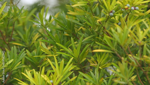 Obraz premium Christmas Tree With Berries. Podocarpus Macrophyllus Berries. Leaves Are Thick And Glossy. Selective focus.