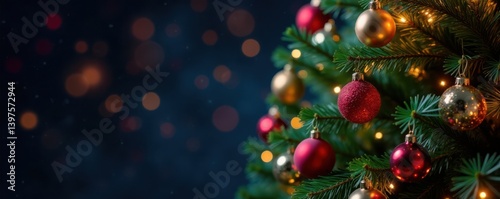 Fototapeta premium Christmas tree with colorful ornaments and lights, Lights, , Christmas Tree