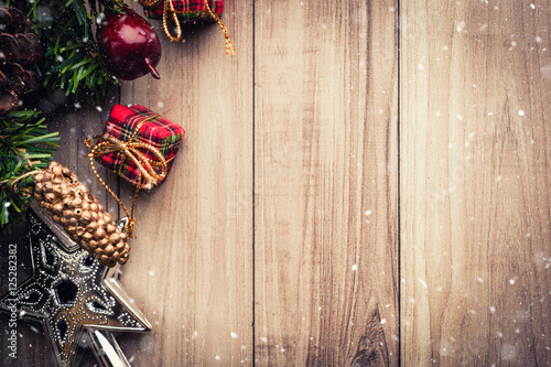 Fototapeta premium Christmas tree with decoration on wooden background
